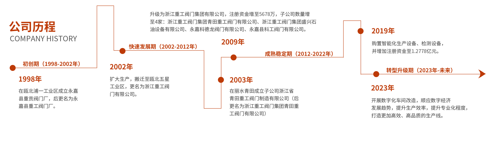 浙江重工閥門集團始創于1999年,總部座落在溫州永嘉甌北五星工業區,總占地面積23800多平方,注冊資金1.2778億元,集團旗下擁有5家子公司,其中全資子公司3家,控股公司2家。公司采用先進的管理模式,實行產品專業化分類生產和銷售,提高產品質量。主要生產基地分布在:浙江溫州、麗水和青田等地,是一家集產品研發、設計、制造與銷售為一體的專業閥門企業,在溫州甌北總部設立:辦公中心、科研中心、銷售中心、質控中心和全過程網絡管理中心……
